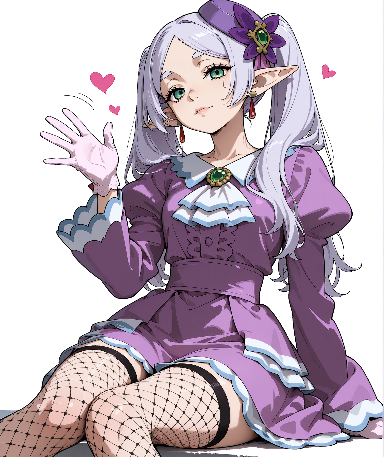 衬衫、长袖、手套、连衣裙、荷叶边、蓬松袖子、黑色过膝袜、白色手套、朱丽叶袖、粉色连衣裙、蓬松长袖、紫色连衣裙、中心荷叶边、领结、白色领结、宝石,