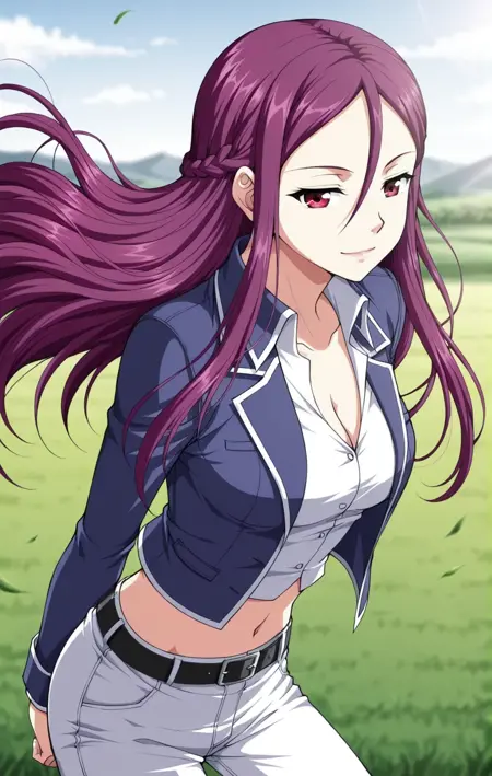 Augus, 1girl, solo, red eyes, purple hair, long hair, parted bangs, hair between eyes, long sidelocks, crown braid,