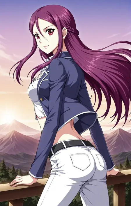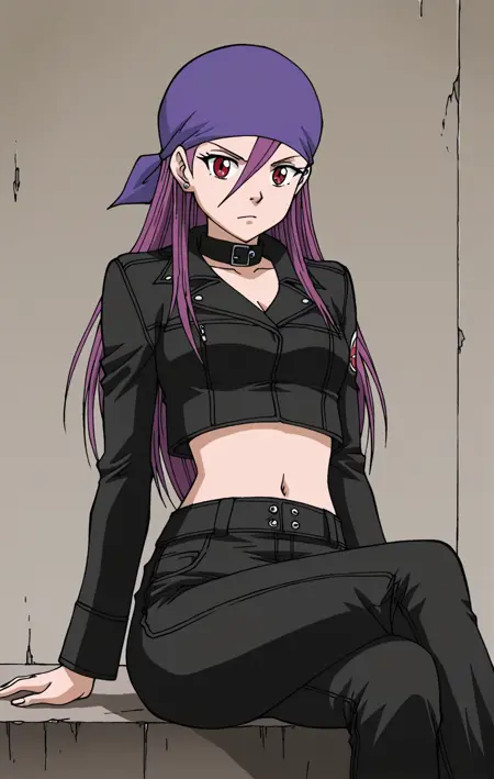 Augus, 1girl, solo, red eyes, purple hair, long hair, hair between eyes, headband scarf,