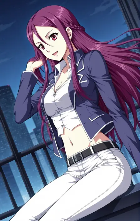 Augus_outfit2, blue blazer, white trim, long sleeves, blazer collar, white shirt, cropped shirt, cleavage, midriff, black belt, white pants, slim pants, black boots, knee high boots,