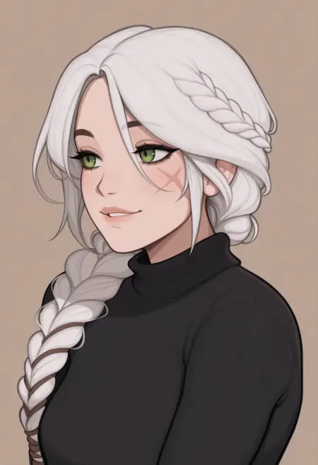 캐릭터 태그: 흰색 머리, 긴 머리, 반왕관 땋기, 땋은 꼬리, 얼굴의 흉터