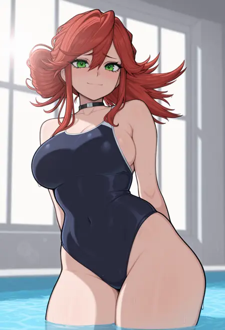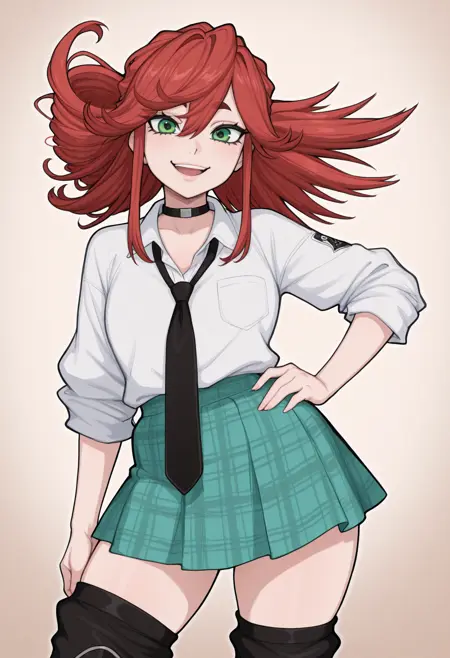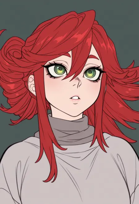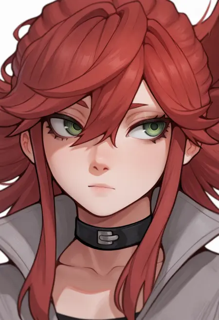 캐릭터 태그: 녹색 눈, 빨간 머리, 긴 머리, 눈 사이의 머리, 비대칭 머리