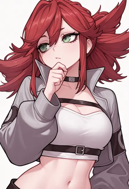 옷 태그: 검은 목걸이, 회색 재킷, 길이 짧은 재킷, 열린 재킷, 긴 소매, 흰색 셔츠, 크롭탑, 가슴 스트랩, 복부, 배꼽, 검은 반바지, 짧은 반바지, 흰색 벨트, 벨트 주머니, 검은 다리 보호대