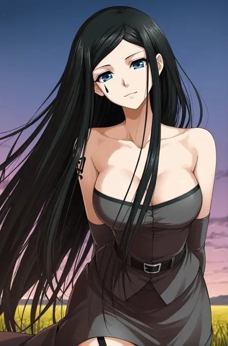 Lilith, 1girl, solo, blue eyes, black hair, very long hair, parted bangs, long sidelocks, shoulder tattoo, teardrop face mark, under eye mark, cheek marking, earrings, shoulder tattoo,
