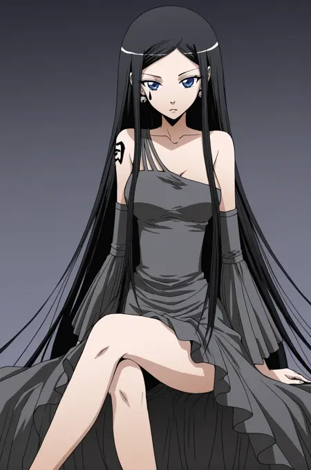 Lilith_outfit1, dark grey dress, one shoulder dress, sleeveless dress, detached sleeves, bell sleeves, flared dress, asymmetrical dress, front short hem, long back hem, grey shoes