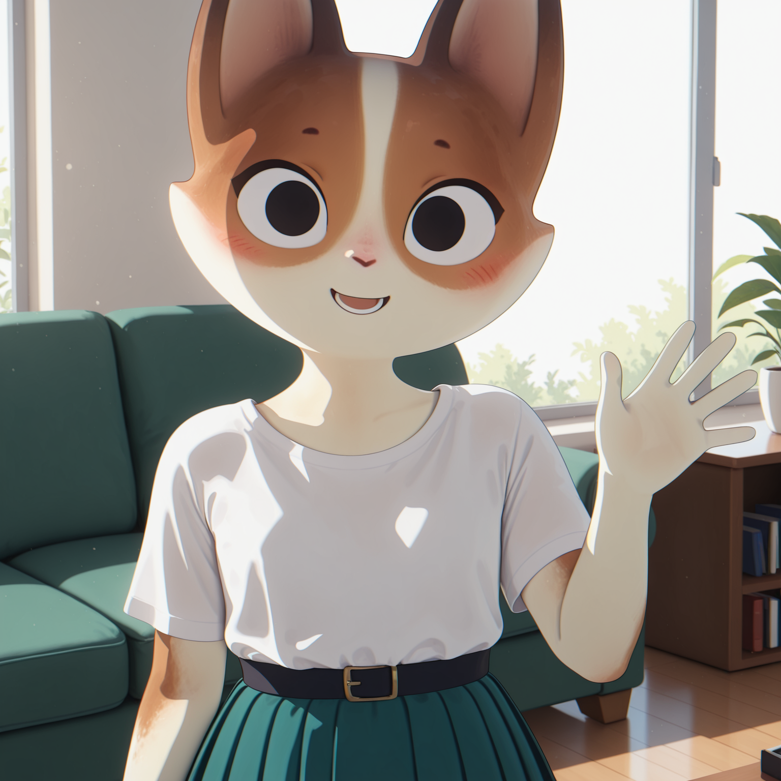 正面提示:KatHTP,毛茸茸的女性,拟人化,猫科动物,猫,黑色眉毛,细小眉毛,黑色眼睛,无瞳孔,粉色鼻子,橙色毛发,白色毛发,白色身体,脸红,扁平胸部