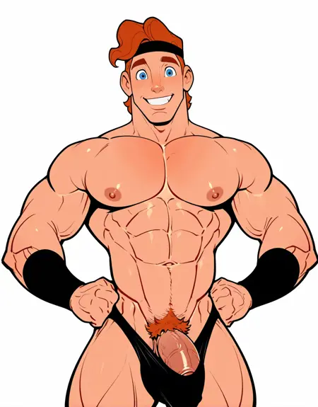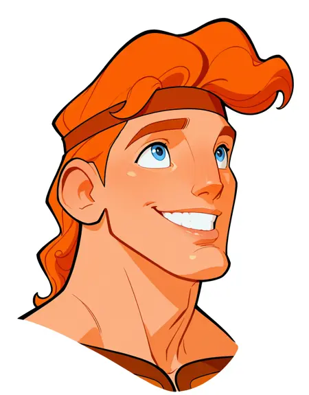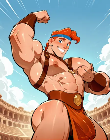 hercules_dis, solo, smile, short hair, brown hair, 1boy, bare shoulders, standing, upper body, closed eyes, male focus, outdoors, cowboy shot, teeth, sleeveless, belt, orange hair, blurry, grin, cape, armor, hand on own hip, muscular, blurry background, headband, wristband, meme, hands on own hips, breastplate, brown belt, blue cape, photo background, red headband, shirt, muscular male, laughing, bracer