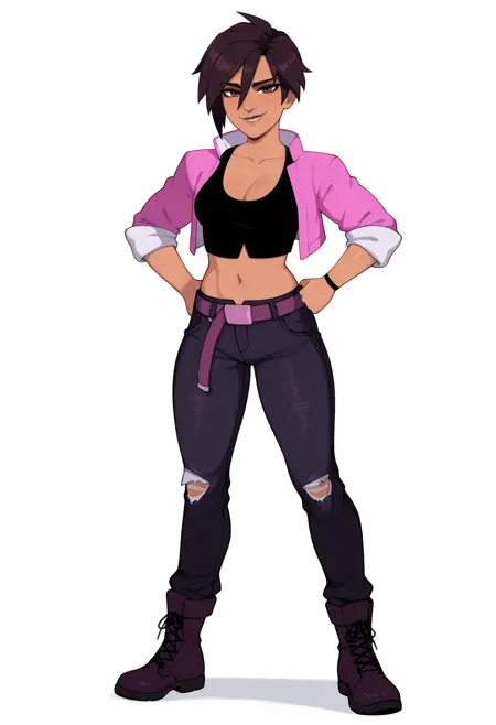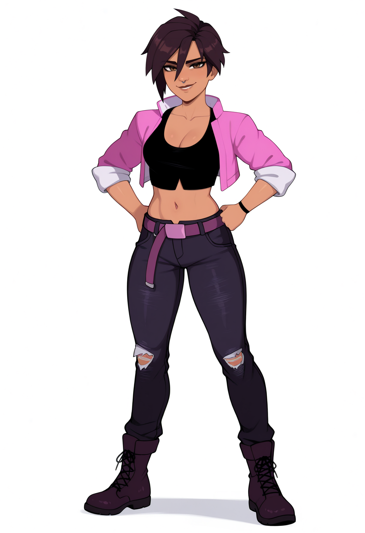 服装提示词:粉色夹克, 短款夹克, 开襟夹克, 黑色露脐上衣, 黑色长裤, 牛仔裤, 破损衣物, 腰带, 黑色靴子, 暴露胸部, 肚脐, 露腹, 锁骨