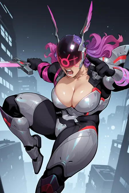 트리거: Ang2099, 근육질의 여자, 긴 머리, 분홍색 머리, 보라색 머리, 그라데이션 머리, 과학 소설, 날개 달린 헬멧, 바이저(갑옷), 페이스페인트, 검은 바디슈트, 파워슈트, 가슴선, 가슴판, 한쪽 어깨 갑옷, 한쪽 팔보호구, 한쪽 회색 팔찌, 회색 팔보호구, 한쪽 분홍색 팔보호구, 한쪽 분홍색 팔 리본, 한쪽 붕대 감은 팔, 한쪽 빛나는 붕대, 검은 장갑, 사타구니 판, 다리 갑옷, 정강이 보호구