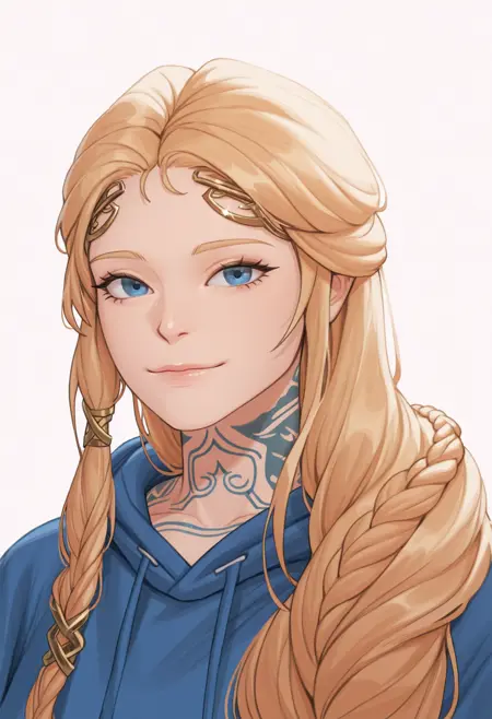 キャラクタータグ:青い目、金髪、非常に長い髪、肩にかかる髪、編み髪、首のタトゥー、腕のタトゥー、髪飾り