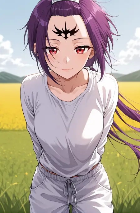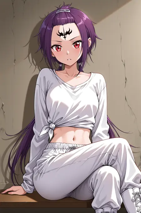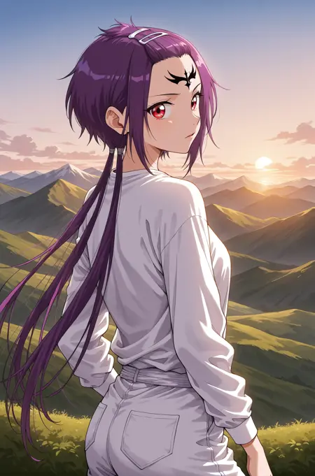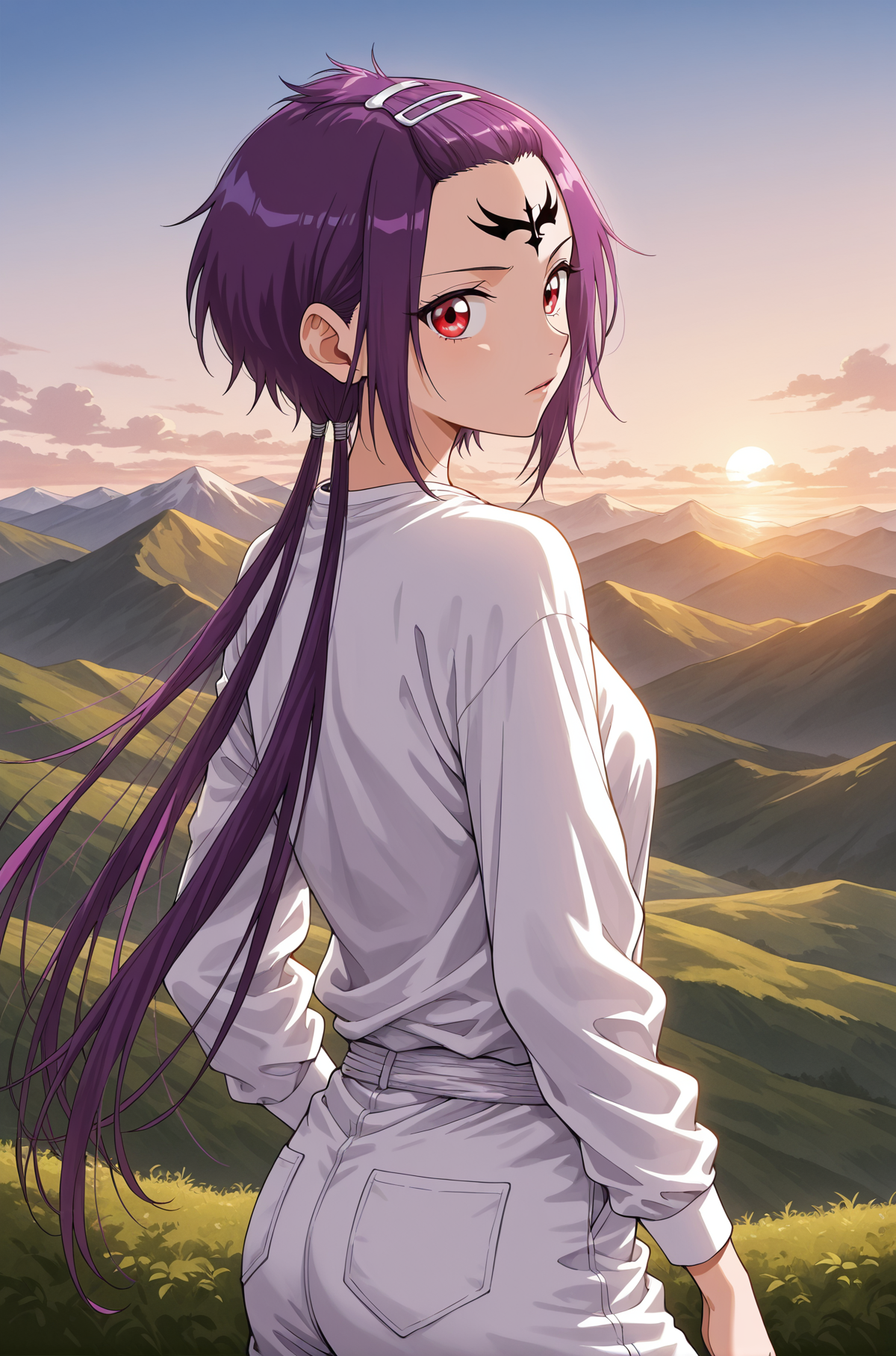 琉璃,1个女孩,单独,红眼睛,紫发,长发,抬高的刘海,绑起的刘海,发夹,白色发夹,长侧发,低双马尾,额头纹身,