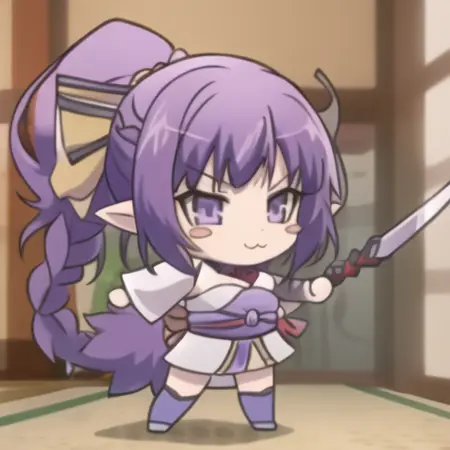 불필요한 추가 태그들인데, 혹시 더 강조가 필요할 때 사용하실 수 있습니다: "[[chibi], [pointy ears], [tail]], [thick arms, thick legs]". 하지만 LoRA 자체만으로도 충분히 잘 작동할 겁니다(제 테스트 기준으로).