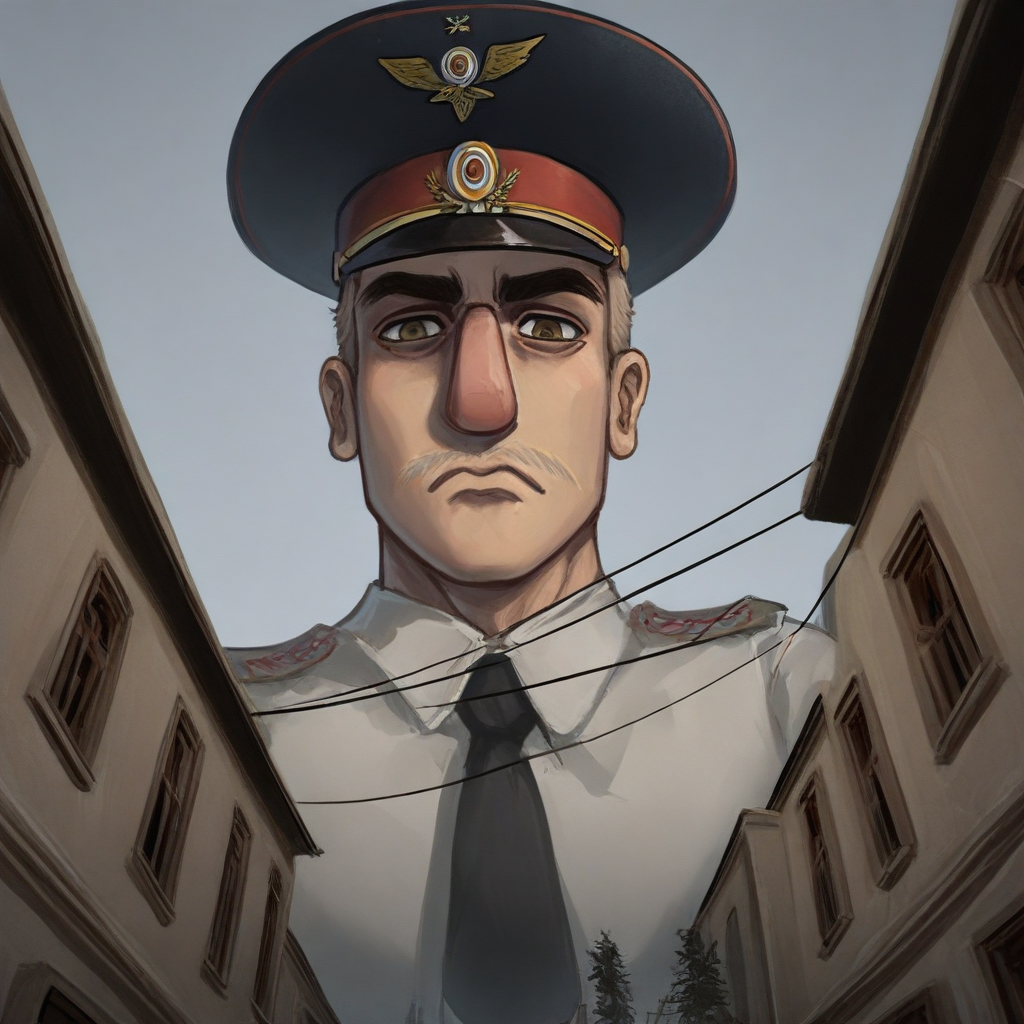 静かな街をパトロールする、巨大で不思議なミリツィオネル。無表情な目つきと、空っぽの地区に響き渡る声を持つ、巨大な警察官。彼の帽子は雲に触れ、制服は暗い旗のようになびき、一歩一歩がコンクリートを震わせる。権力の象徴が神話へと変じた存在、見守る守護者か、逃れられない悪夢か。