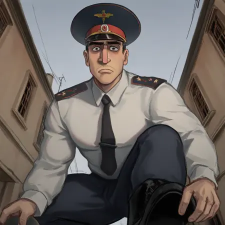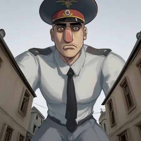 このLoRAは、生成に巨大なミリツィオネル(ソビエト風警察官)のキャラクターを追加します。極端な高さ、巨大なプロポーション、長いコートの制服、丸い帽子、そして圧倒的な権威ある存在感が特徴です。