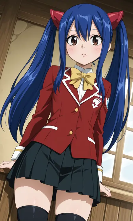 ウェンディ・マーベル(フェアリーテイル 全シーズン), 1人女の子, シングル, 非常に長い髪, ツインテール, 茶色の目, 青髪, 髪飾り, 平らな胸, 乳房, 小さな乳房, タトゥー, 目の間の髪, サイドロックス, 太もも, アニメカラー, スカート, シャツ丈丈下, 学校制服, 絶対領域, 髪飾り, ジャケット, プリーツスカート, 赤ジャケット, 白シャツ, シャツ, 黒シャツ丈丈下, 黒スカート, 長袖, ボウタイ, 黄色いボウタイ, 靴, 灰色の靴, サンダル, 灰色のサンダル, 黄色いリボン,