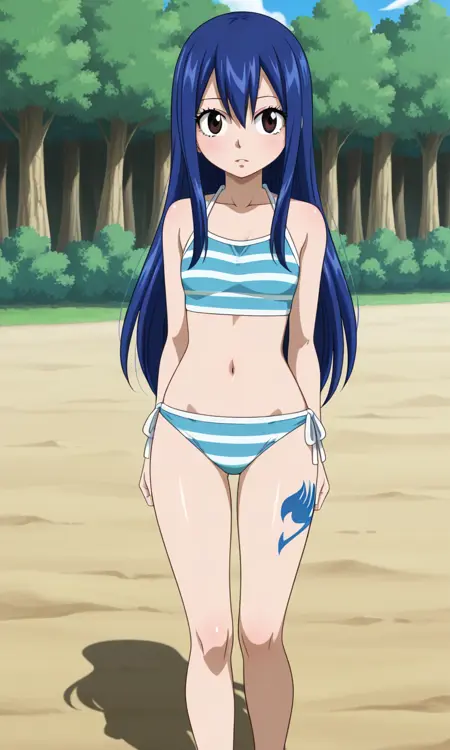 ウェンディ・マーベル(フェアリーテイル 全シーズン), 1人Girl, シングル, 長い髪, リボン付き, ハイポニーテール, 茶色い目, 青い髪, タトゥー, 目の間の髪, サイドロックス, 平らな胸, 胸, 小さな胸, 太もも, アニメ風カラーリング, ボウ, リボン, 水着, ビキニ, 縞模様, 青いビキニ, 縞模様のビキニ, へそ, 裸足