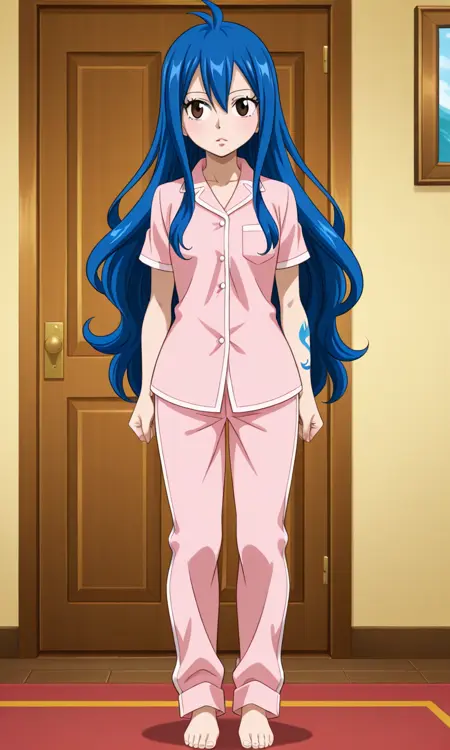 ウェンディ・マーベル(フェアリーテイル 全シーズン), 1人女の子, シングル, 非常に長い髪, 茶色の目, 青髪, タトゥー, 目の間の髪, サイドロックス, 両サイドアップ, 平らな胸, 乳房, 小さな乳房, 太もも, アニメカラー, 長袖, パジャマ, アクアパジャマ, パンツ, アクアパンツ, 裸足,