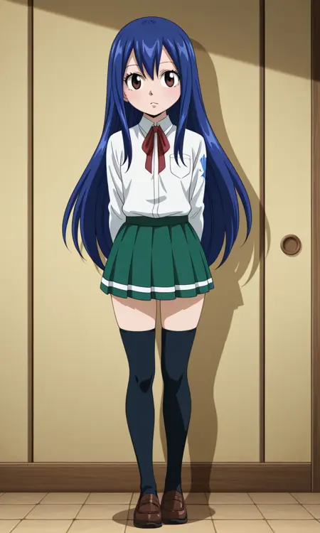 ウェンディ・マーベル(フェアリーテイル 全シーズン), 1人女の子, 単独, 長い髪, 茶色い目, 青い髪, タトゥー, 目の間の髪, 横髪, 平らな胸, 胸, 小さな胸, 太もも, アニメ風カラーリング, シャツ, リボン, 学校制服, ブレザー, ジャケット, 白いシャツ, パンスト, スカート, 黒いパンスト, 帯, 長袖, 靴, ローファー, 茶色いローファー, 茶色い靴, ポロシャツ, 黒いジャケット, 首リボン, 青いスカート, プリーツスカート