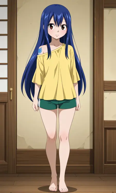 ウェンディ・マーベル(フェアリーテイル 全シーズン), 1人女の子, 単独, 非常に長い髪, 茶色い目, 青い髪, タトゥー, 目の間の髪, 横髪, 平らな胸, 胸, 小さな胸, 太もも, アニメ風カラーリング, ショートパンツ, 裸足, シャツ, 黄色いシャツ, 緑のショートパンツ, 肩出し