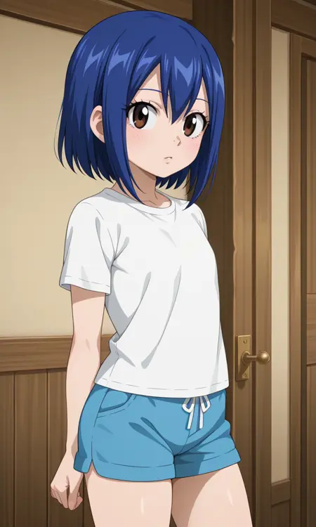 ウェンディ・マーベル(フェアリーテイル 全シーズン), 1人女の子, 単独, 短い髪, 子供, 年齢ダウン, 平らな胸, 胸, 小さな胸, 茶色い目, 青い髪, 目の間の髪, 横髪, 太もも, アニメ風カラーリング, シャツ, 白いシャツ, ショートパンツ, 青いショートパンツ
