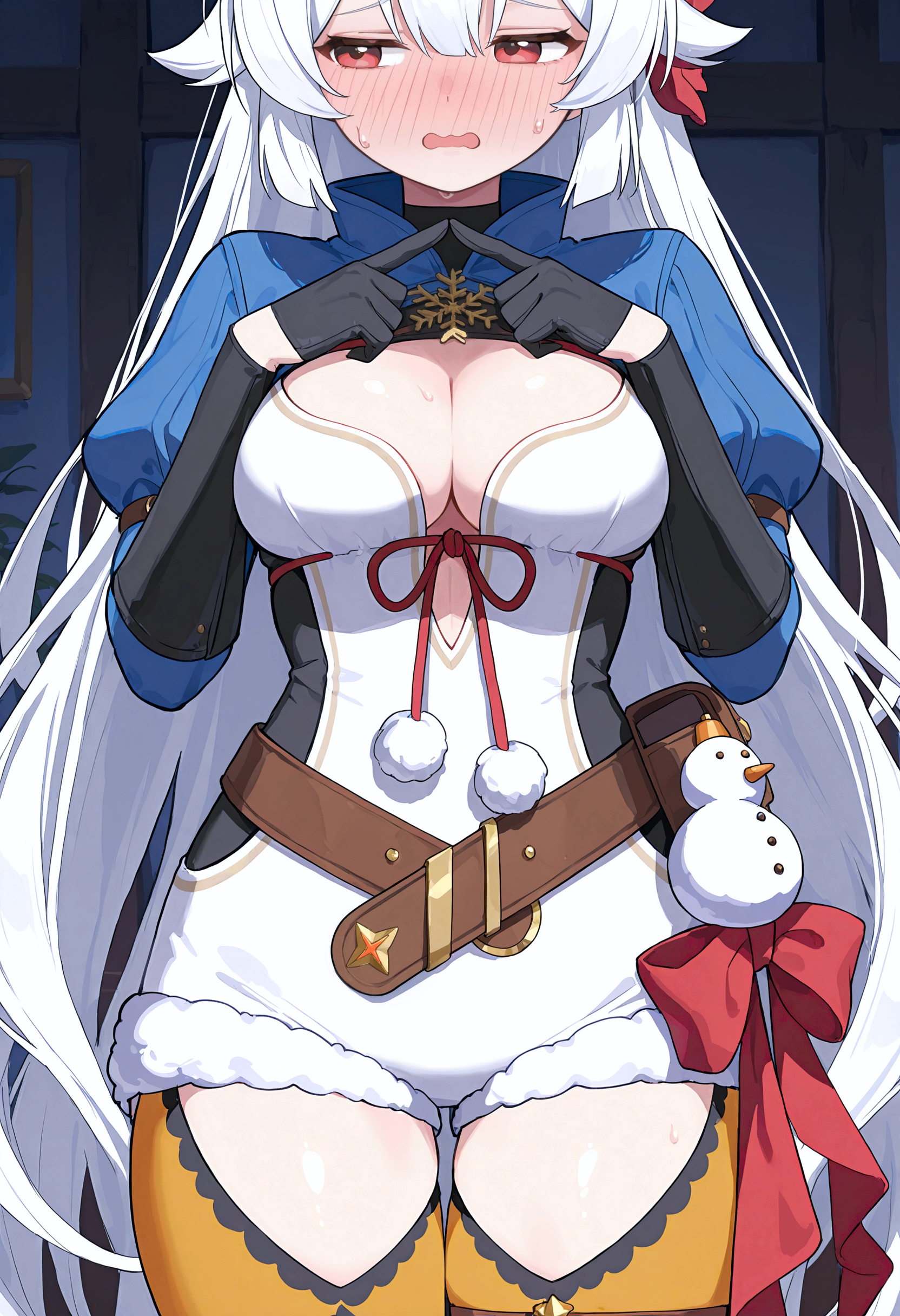 파란색 스러그(옷), 눈송이 브로치, 줄리엣 소매, 가슴 부분 절개, 빨간 리본, 가슴 리본, 펌프(옷), 흰색 드레스, 검은 바디수트, 옆 절개, 검은 장갑, 반장갑, 검은 손목 보호대, 갈색 벨트, 벨트 주머니, 별 모양 벨트 장식, 가방 매달린 장식, 빨간 리본, 엉덩이 리본, 흰색 반바지, 짧은 반바지, 털 장식이 있는 반바지, 주황색 레깅스, 레이스 장식이 있는 레깅스, 허벅지 절개, 갈색 허벅지 스트랩, 발목 부츠, 이색 부츠, 파란 부츠, 털 장식이 있는 부츠,