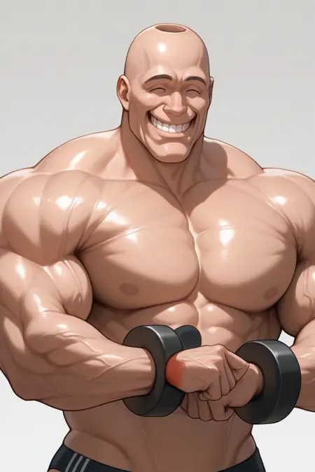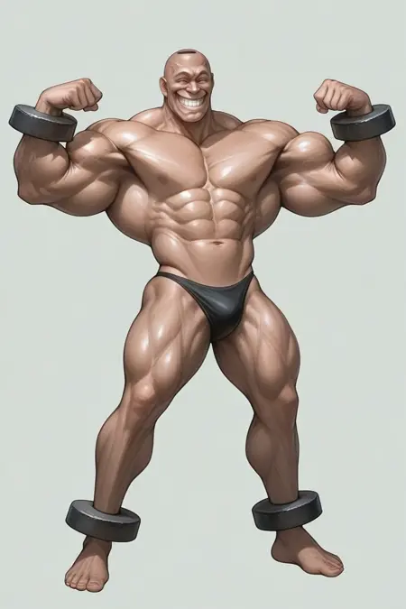 사무슨: adon_samson, dark tan, hyper_muscular_male, flexing_grin, thin waist, weighted_bracelet, ankle_weights, black_aniki_brief,