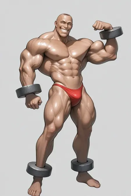 아돈: adon_samson, fair skin, hyper_muscular_male, flexing_grin, thin waist, weighted_bracelet, ankle_weights, red_aniki_brief,
