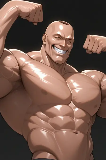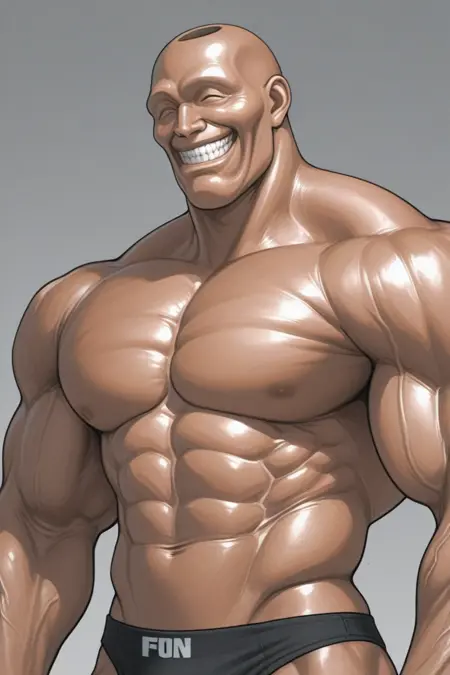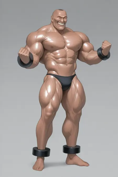 サムソン:adon_samson,dark tan,hyper_muscular_male,flexing_grin,thin waist,weighted_bracelet,ankle_weights,black_aniki_brief,