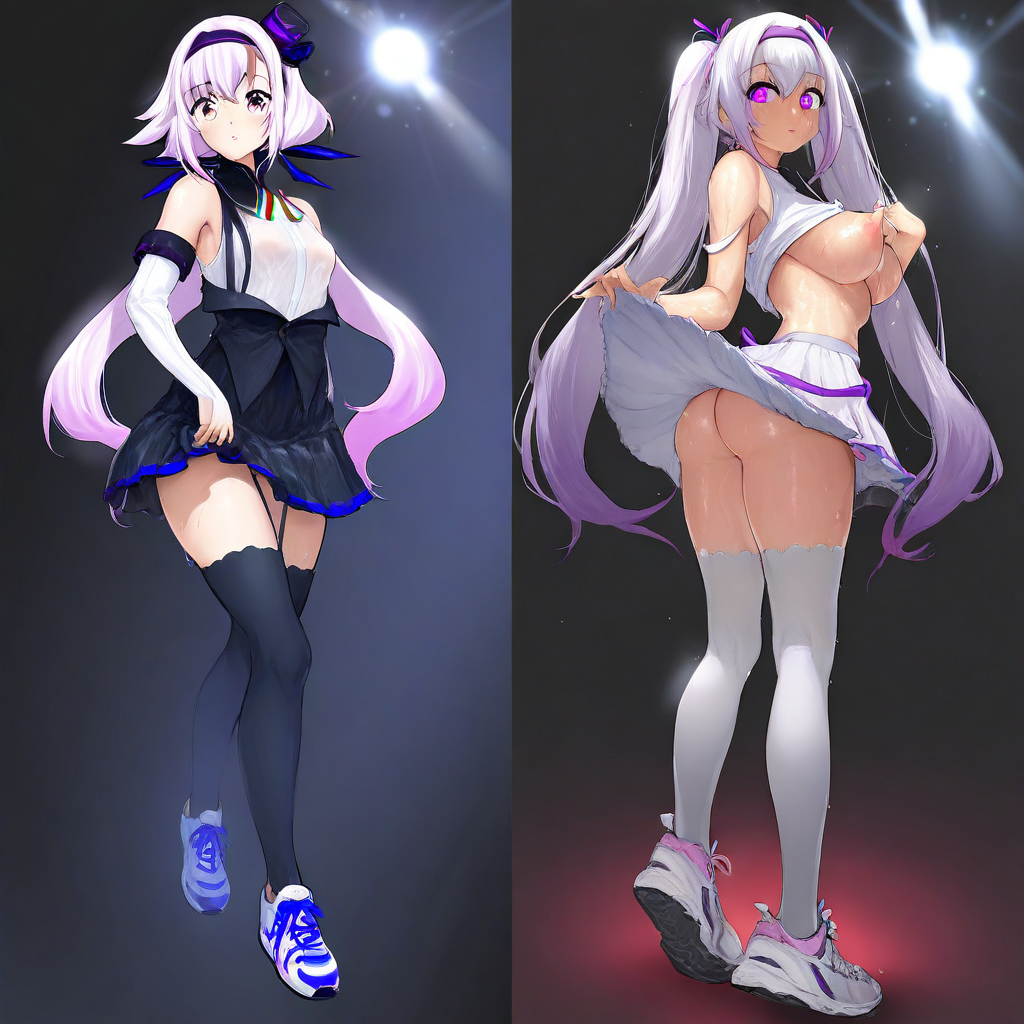 (VTuber_Pino, 긴 머리, 다색, 보라색 머리, 흰색 머리, 눈 사이의 머리카락, 트윈테일, 보라색 눈, 헤드밴드, 셔츠, 분리된 소매, 치마, 허벅지 길이 양말, 스니커즈),