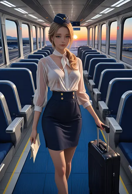 Built for SDXL workflows, this pack focuses on fitted uniforms, pencil skirts, scarves, rolling cases, and aisles lit by soft cabin lights or bright airport windows. Perfect for character concepts, story scenes, and upscale travel-themed renders with just a hint of flirt.