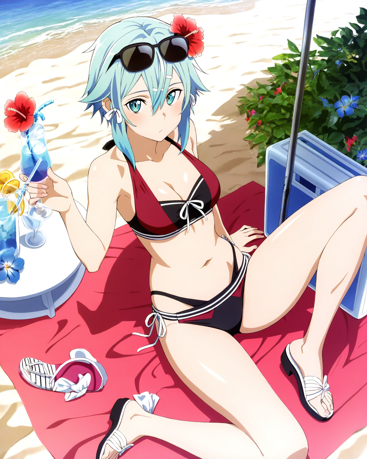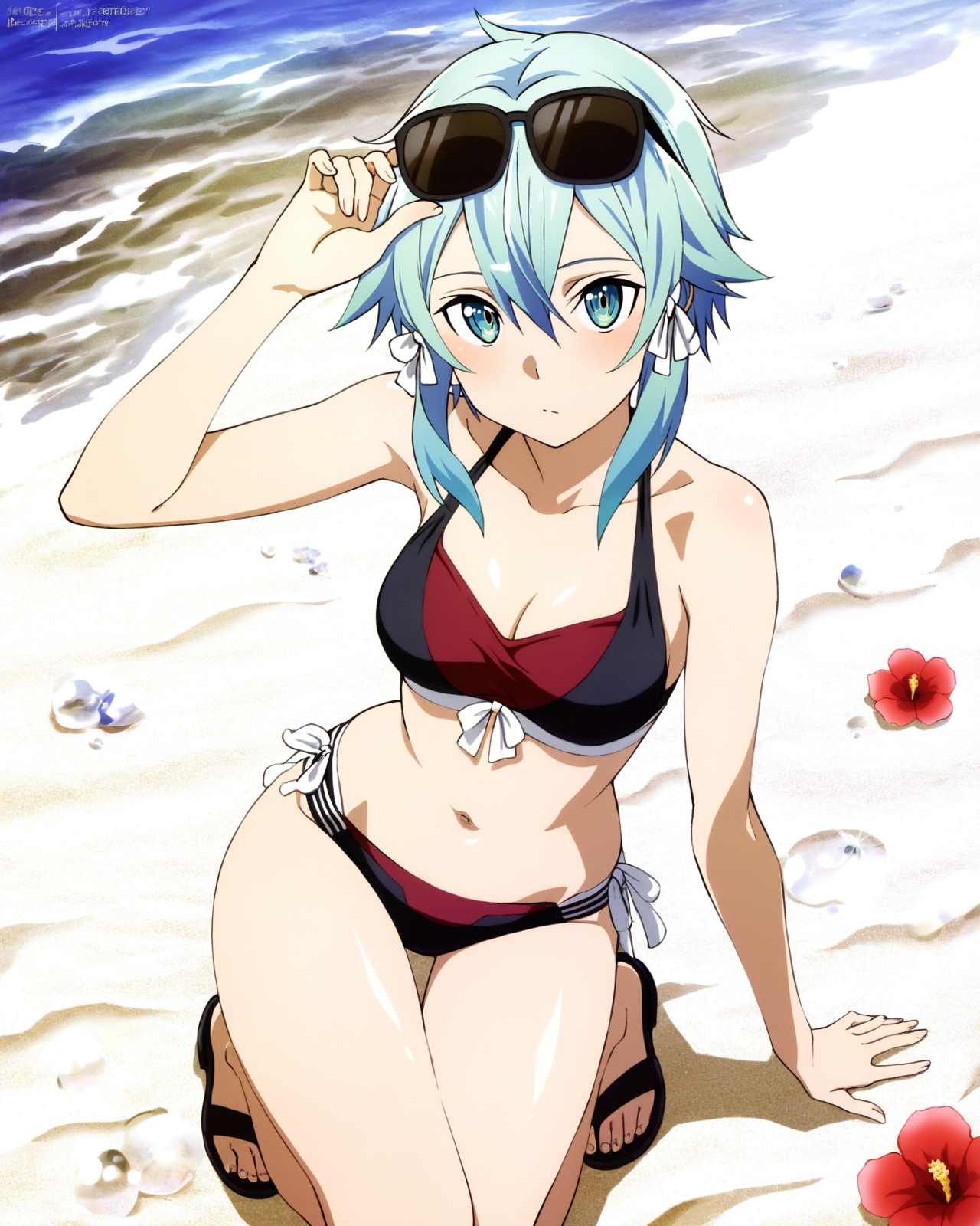 머리 장식, 배꼽, 리본, 보석, 수영복, 머리 리본, 비키니, 프릴, 맨발, 배, 목걸이, 생식기, 팔 노출, 다리 노출, 사이드 티 밴드 비키니 하의, 흰 리본, 파란 비키니, 펜던트, 프릴 비키니, 회색 리본, 어깨 노출