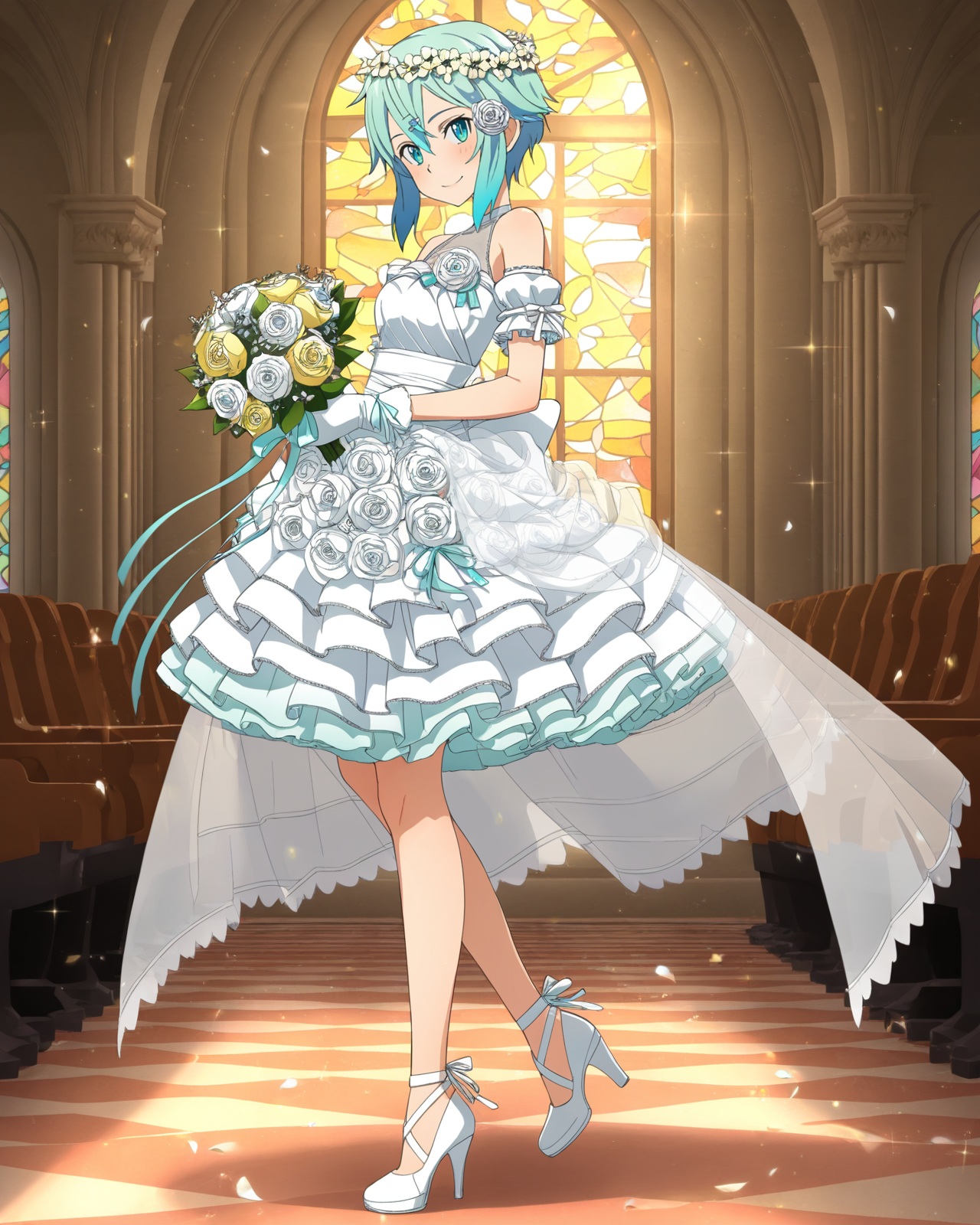 분리된 소매, 검은 허벅지 긴 양말, 흰 장갑, 검은 신발, 흰 드레스, 파란 드레스, 허벅지 부츠, 어깨 갑옷, 흰 리본, 긴 치마, 파란 신발, 어깨 보호대, 가슴 갑옷, 긴 드레스, 파란 장갑, 파란 허벅지 긴 양말, 갑옷 드레스, 허벅지 보호대, 비대칭 소매, 파란 소매, 파란 갑옷, 날개, 빛나는, 흰 치마, 측면 슬릿, 층층이 된 치마, 허리 망토, 불균형한 소매,