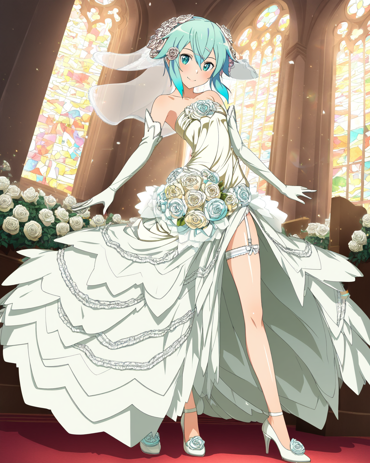 머리 장식, 가슴선, 연한 파란 테두리, 프릴 셔츠, 소매 없음, 머리 꽃, 흰 속옷, 할터넥, 당황함, 신발 없음, 깔창 끈, 연한 파란 셔츠, 흰 줄무늬, 줄무늬 허벅지 긴 양말, 파란 속옷, 파란 허벅지 긴 양말, 파란 장미, 머리 화관, 흰 장미, 프릴 속옷, 보라 장미, 어깨 노출,