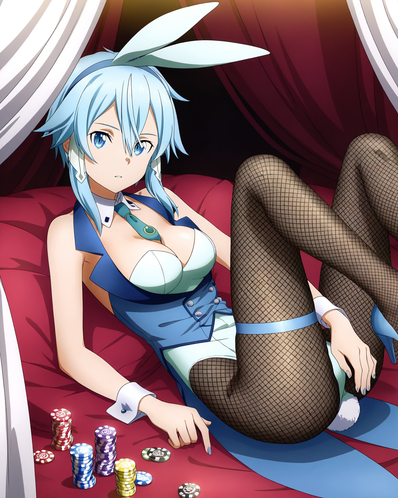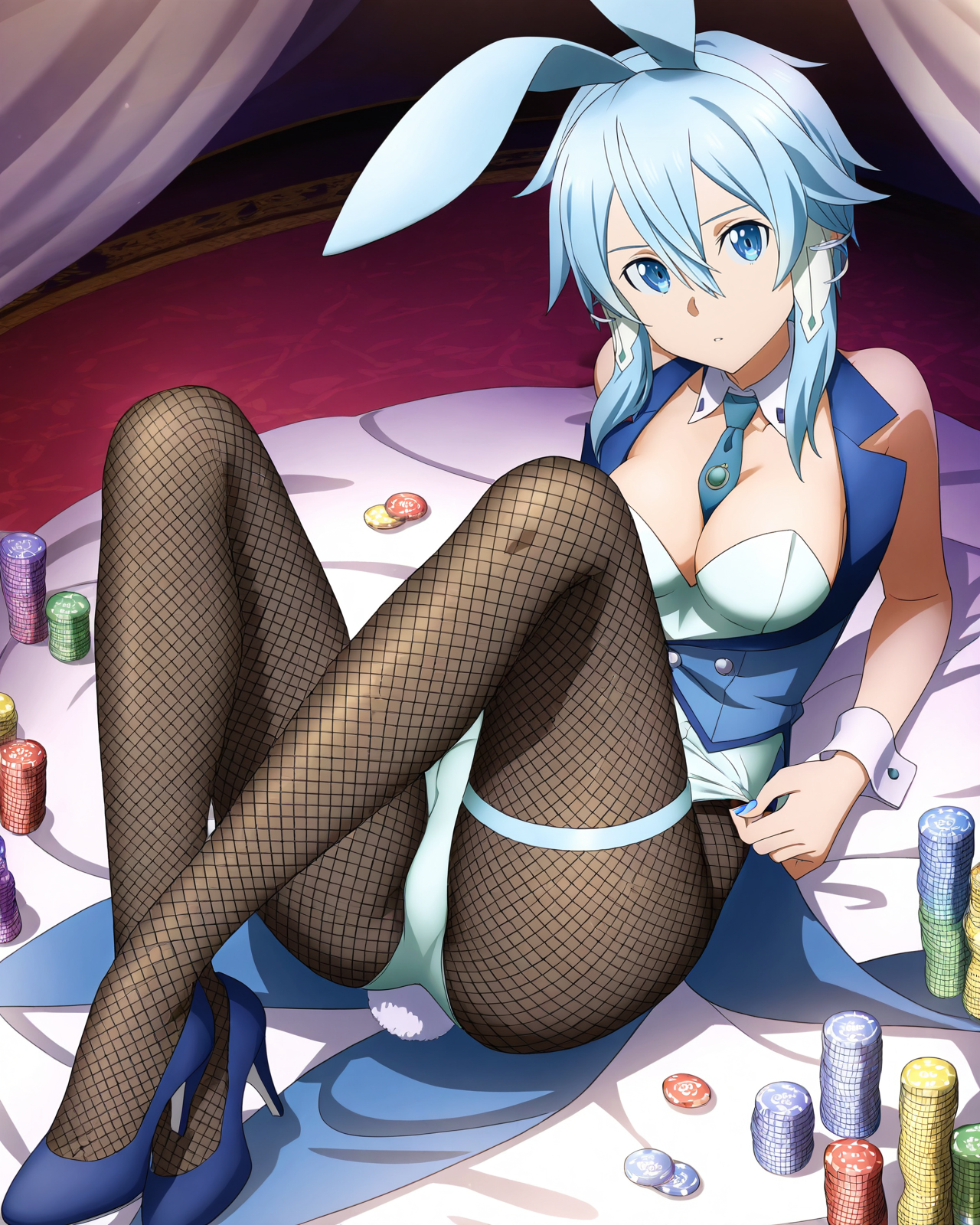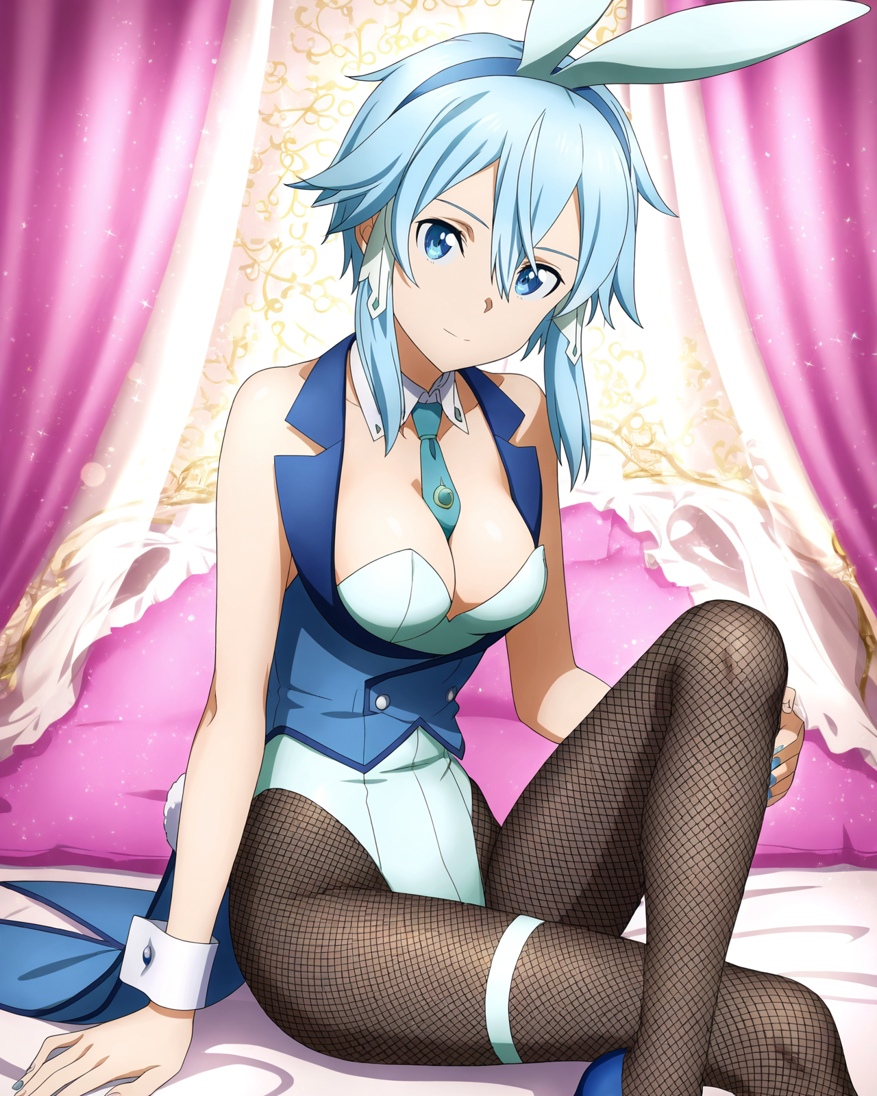 cleavage, pantyhose, hairband, necktie, rabbit ears, leotard, high heels, black pantyhose, wrist cuffs, strapless, fake animal ears, thigh strap, detached collar, playboy bunny, wing collar, rabbit tail, fishnets, strapless leotard, highleg leotard, blue nails, blue necktie, blue footwear, white leotard, fishnet pantyhose, blue leotard, blue hairband, necktie between breasts, short necktie, pumps, coattails, tail