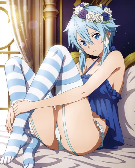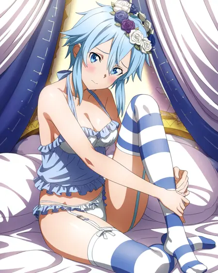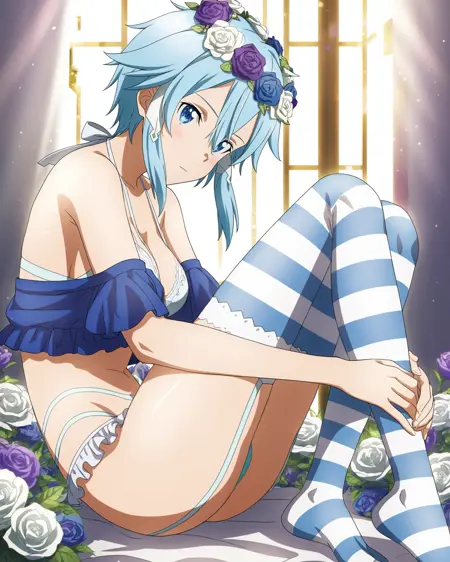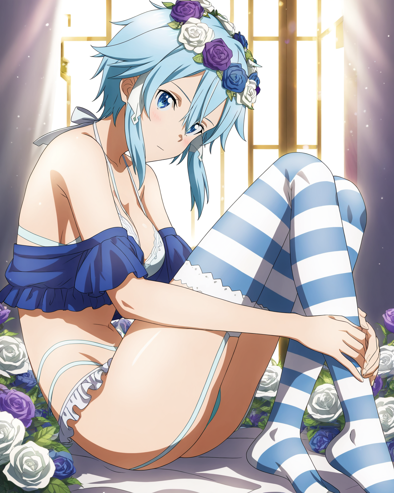 hair ornament, cleavage, light blue trim, frilled shirt, sleeveless, hair flower, white panties, halterneck, embarrassed, no shoes, garter straps, light blue shirt, white stripes, striped thighhighs, blue panties, blue thighhighs, blue rose, head wreath, white rose, frilled panties, purple rose, bare shoulders,