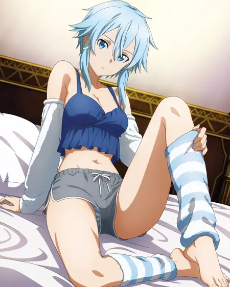 navel, cleavage, striped sleeves, arm warmers, barefoot, midriff, striped clothes, white thighhighs, short shorts, striped thighhighs, blue shorts, blue bra, grey shorts, dolphin shorts, sleepwear, detached sleeves, sleeveless, blue shirt, white sleeves, leg warmers
