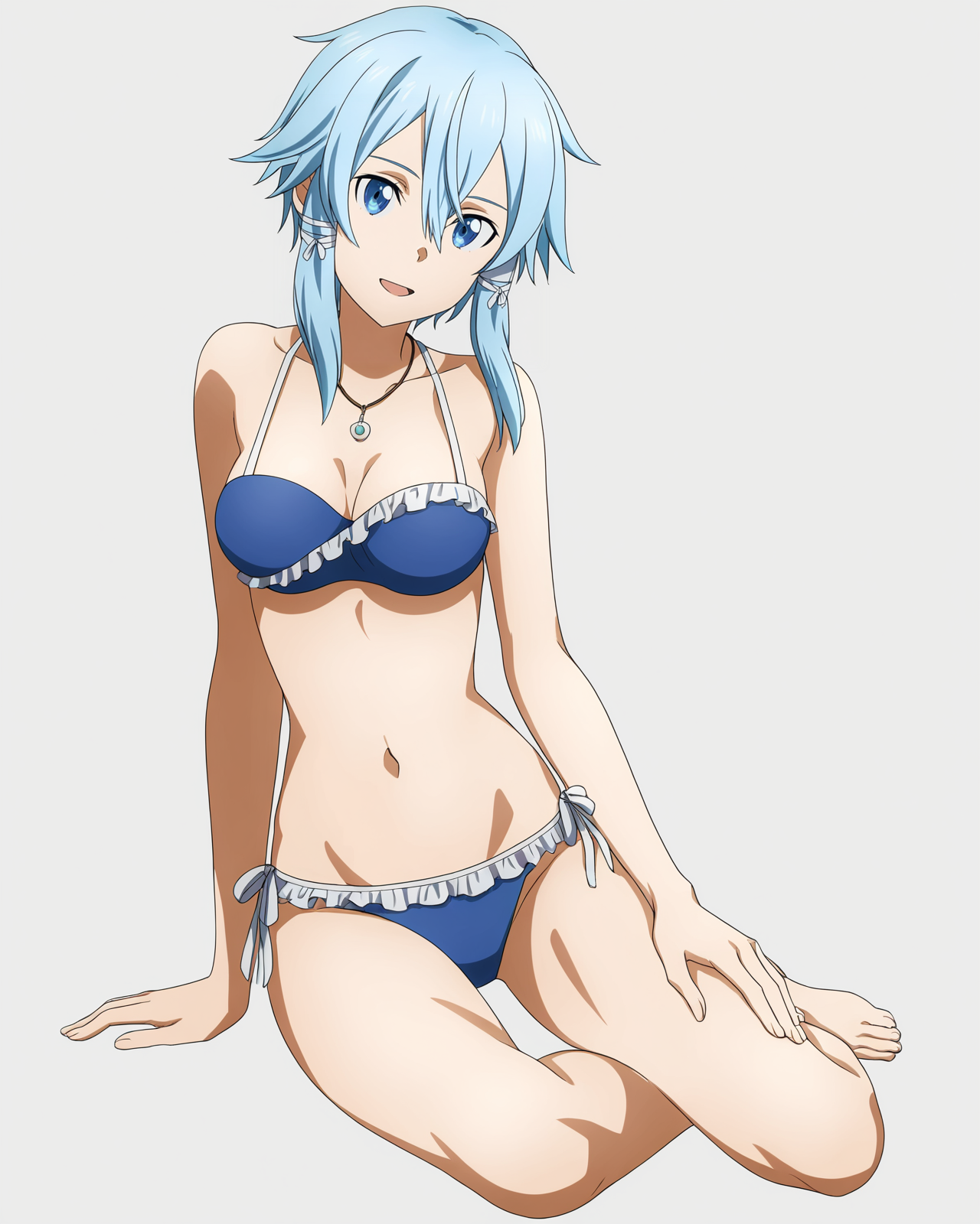 hair ornament, navel, ribbon, jewelry, swimsuit, hair ribbon, bikini, frills, barefoot, stomach, necklace, groin, bare arms, bare legs, side-tie bikini bottom, white ribbon, blue bikini, pendant, frilled bikini, grey ribbon, bare shoulders