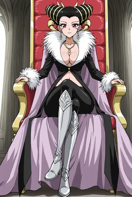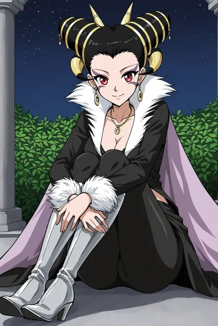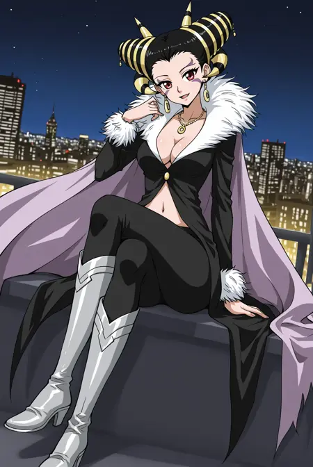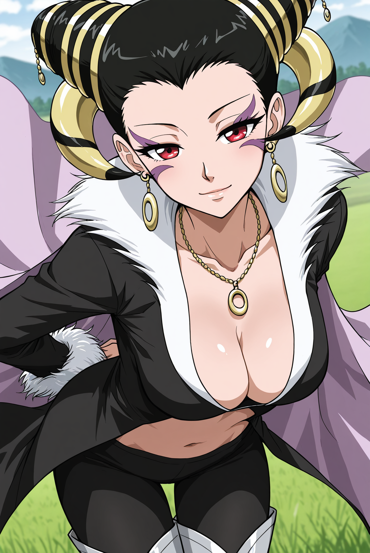 Blackwi_outfit, gold back accessory, gold back rods, purple cape, black coat, long coat, wide collar, white collar, cleavage, midriff, long sleeves, white fur cuffs, gold necklace, pendant necklace, black leggings, thighhigh boots, silver armor boots,