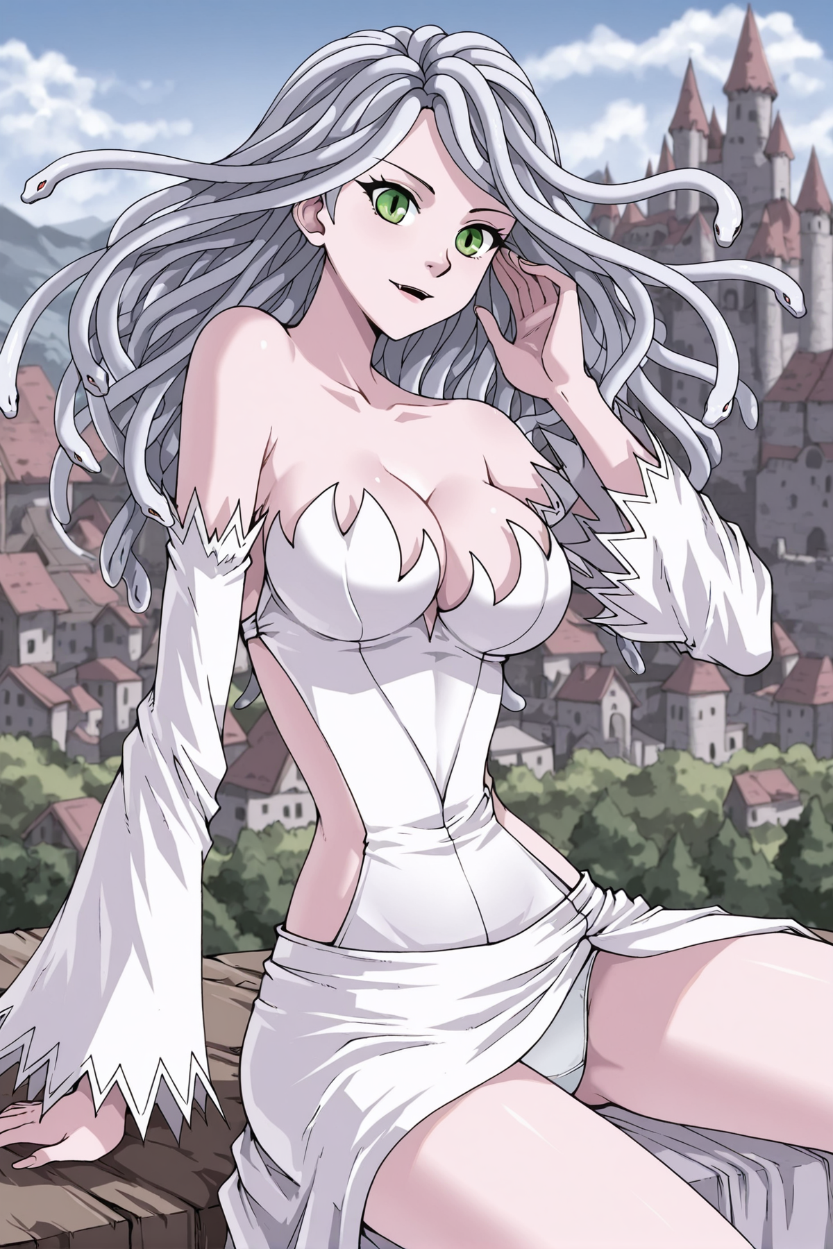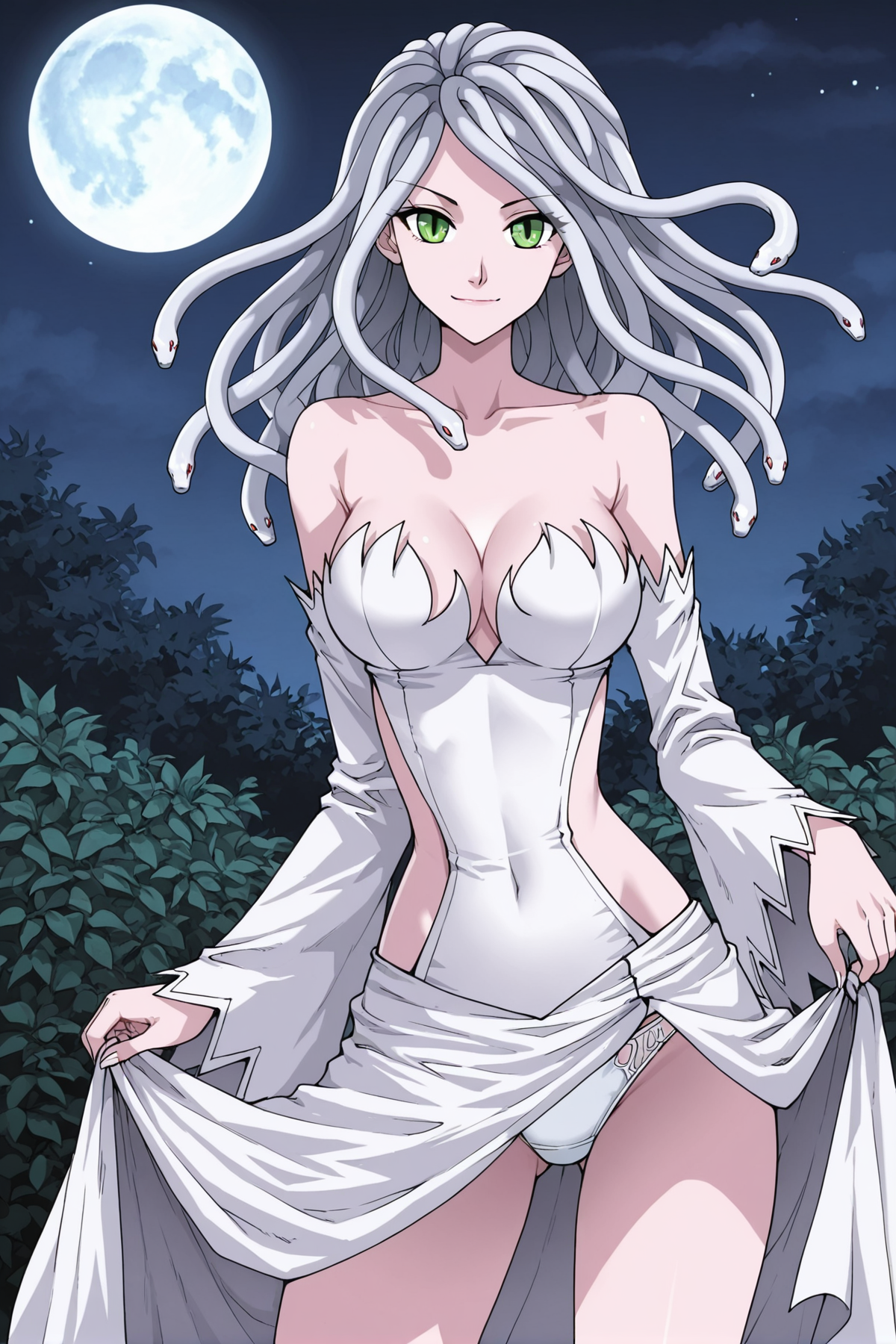 Whitewi, 1소녀, 솔로, 녹색 눈, 흰색 머리, 긴 머리, 뱀 모양 머리,