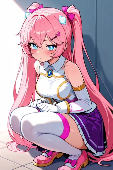 중간 크기의 가슴, AngelicBusterdef, 어깨 노출, 흰색 셔츠, 분홍색 리본, 흰색 장갑, 주름치마, 보라색 치마, 허벅지 길이 양말, 신발, 분홍색 신발,