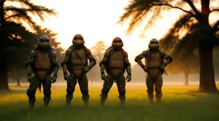 良い知らせです!SDXLは、私がリリースしたSD 1.5版よりもグループ生成がはるかに優れています。TMNTGroupは、プロンプトのみで少なくとも3体のタートルを生成し、アスペクト比が16:9に近い場合は4体まで可能ですが、私はControlNetを使用して初めて安定して4体のタートルを生成できました。提供した4枚の画像は、1枚がプロンプトのみ、1枚がControlNetを使用したものです。