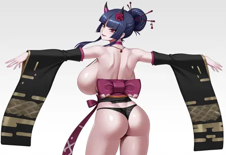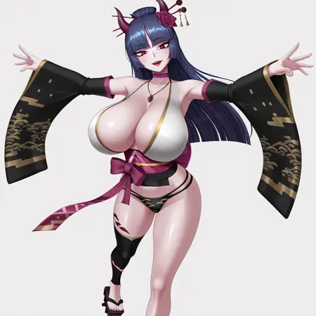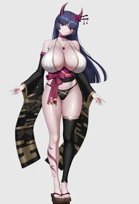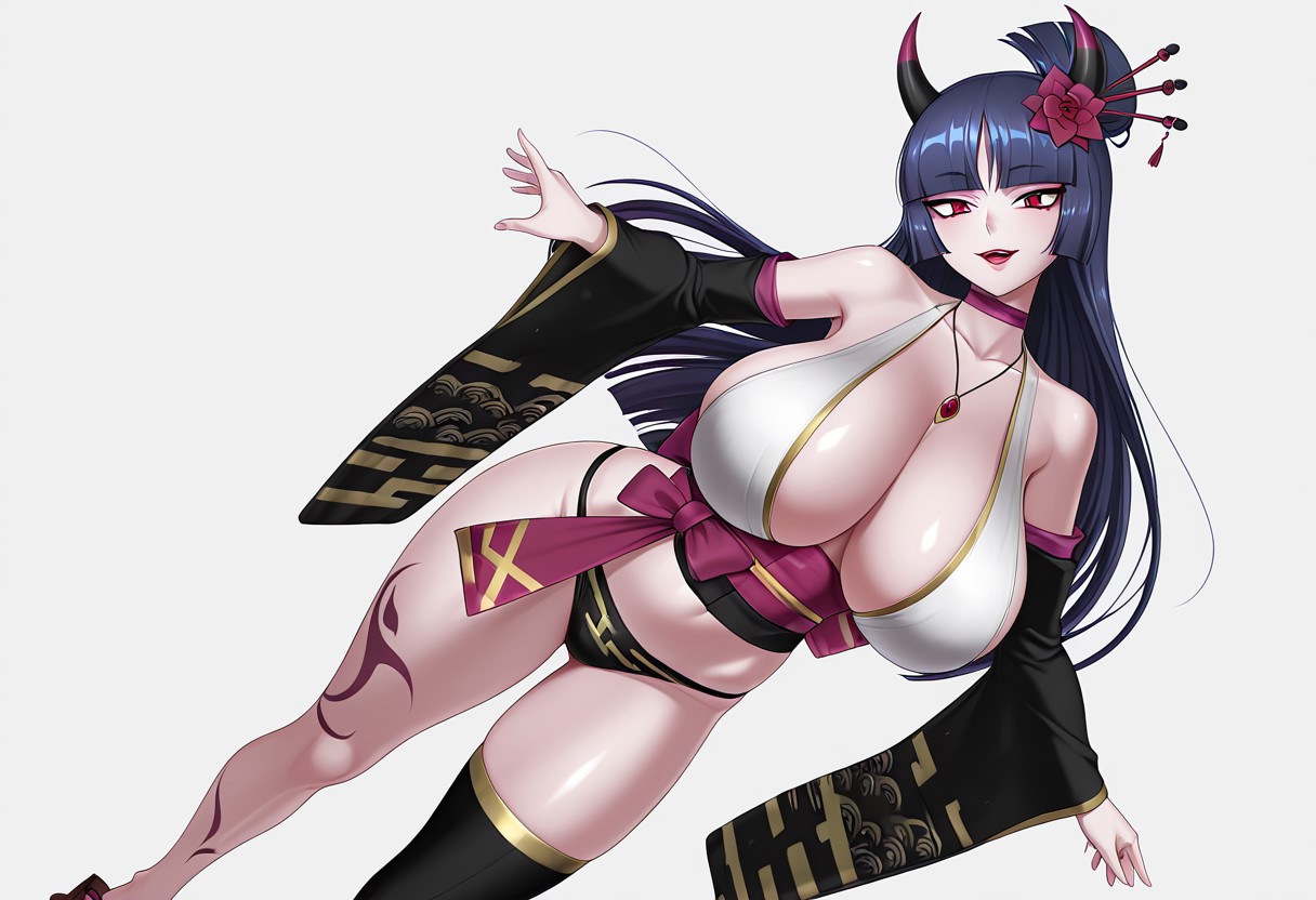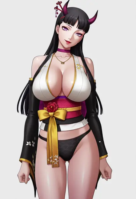 TAGS : Corpse Princess,jewelry,black panties,japanese clothes,detached sleeves,choker,necklace,black detached sleeves,horns,red flower,hair stick,head tilt,obi,sash,red lips,