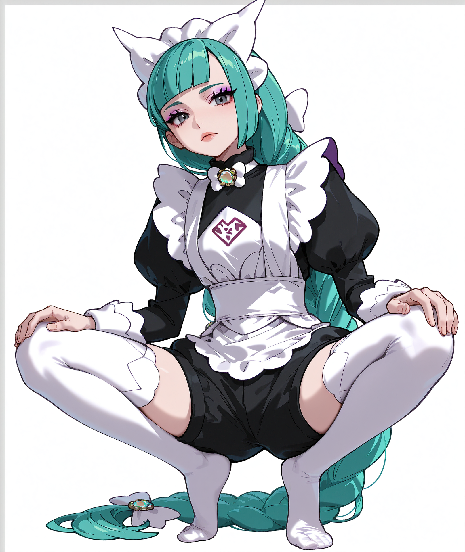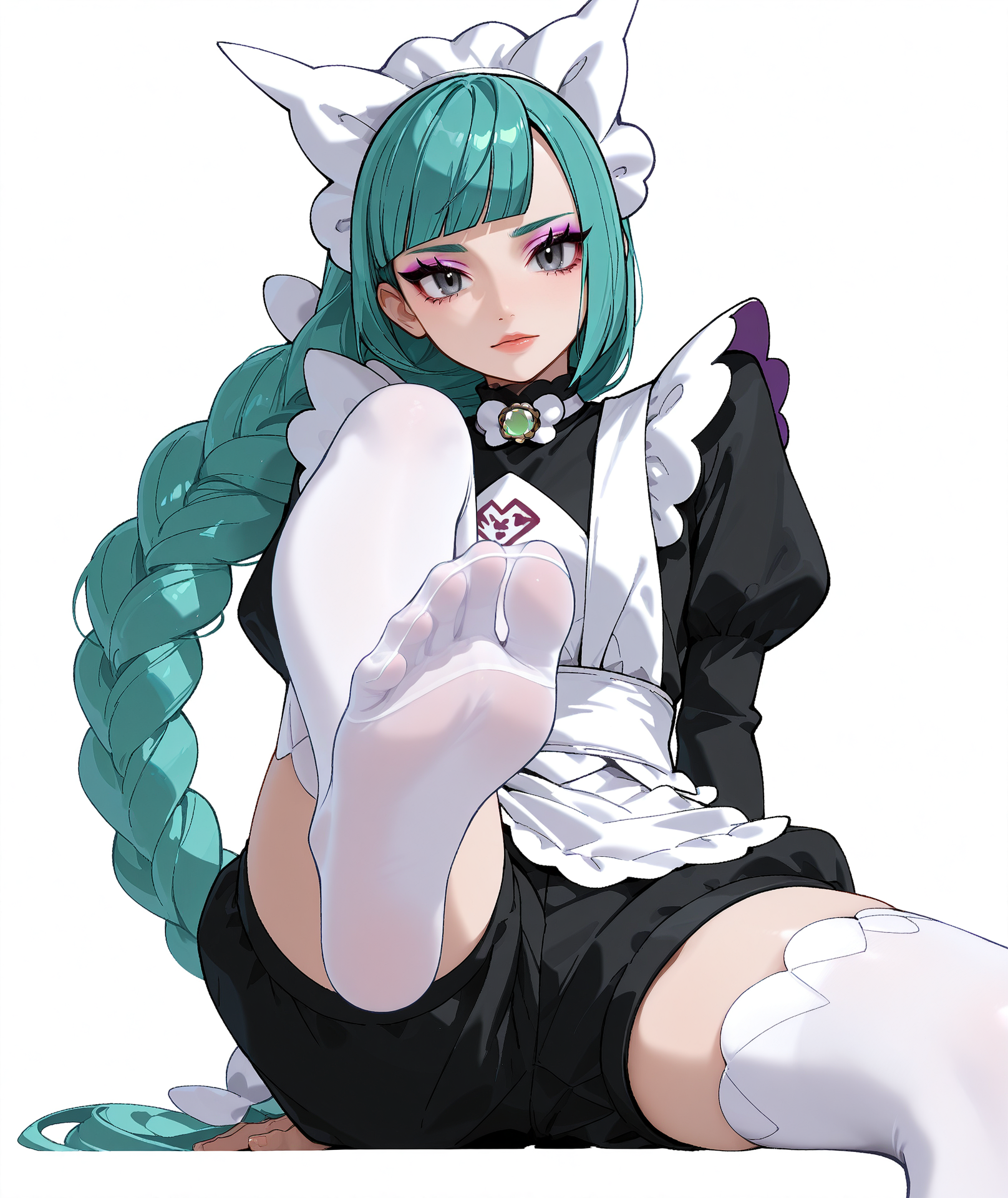 1. eyelashes, nose, lips, long hair, very long hair, braid, green hair, blunt bangs, black eyes, grey eyes, single braid, makeup, aqua hair, braided ponytail,
