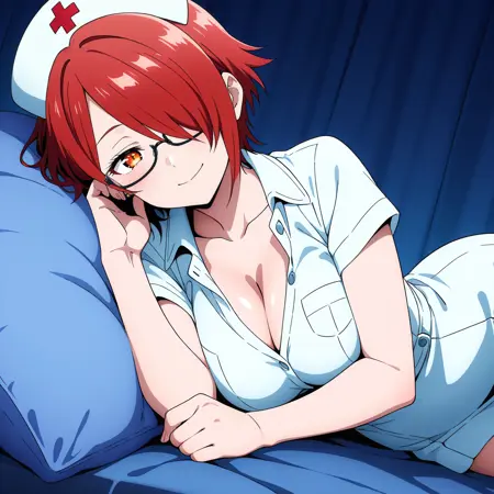 hat, collarbone, shirt, short sleeves, cleavage, nurse cap, white shirt, collared shirt, buttons,