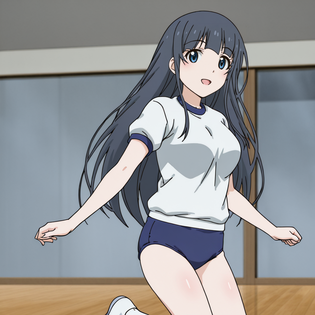 - 블루머 트리거: ShizunaBloomer, 1girl, 체육복, 긴 머리, 파란 눈, 파란 부루마, 검은 머리, 흰 셔츠, 흰 양말, 카우보이 샷