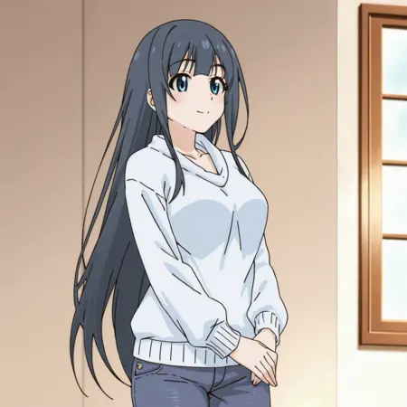 - 트리거: Shizuna, 1girl, 긴 머리, 중간 크기 가슴, 파란 눈, 가슴 노출, 복부, 배꼽, 검은 머리, 탱크탑, 앞머리, 반바지, 흰 셔츠