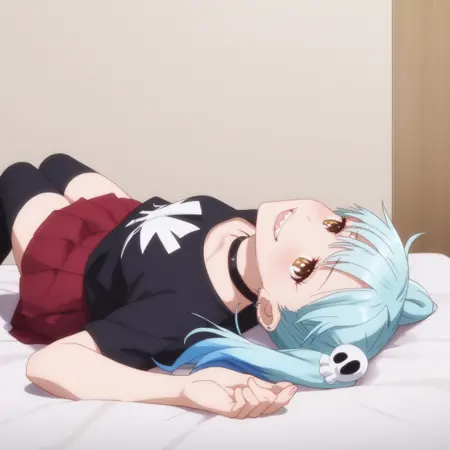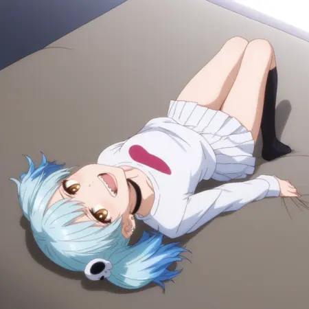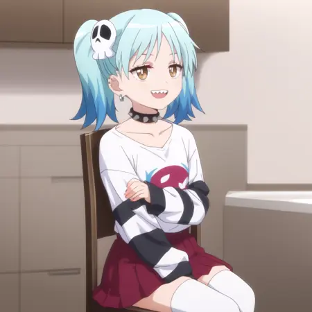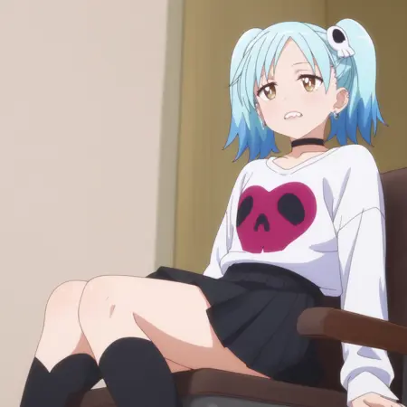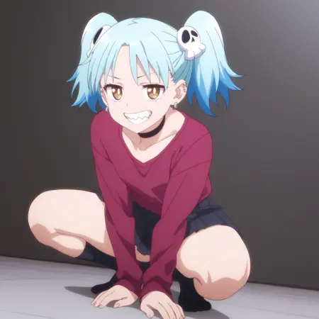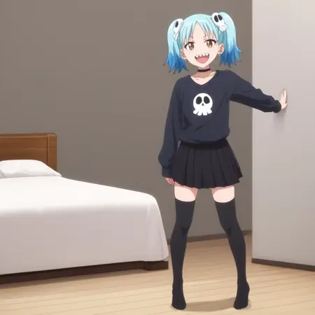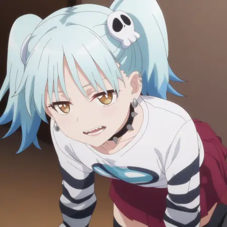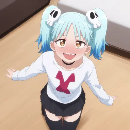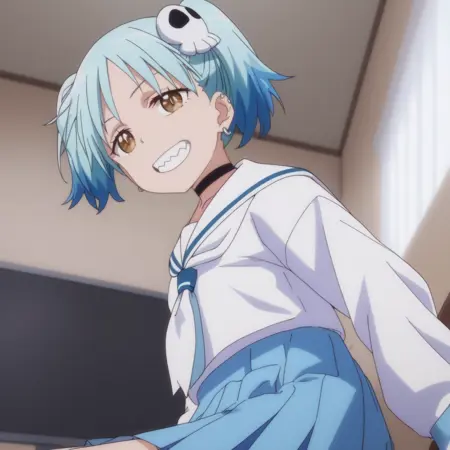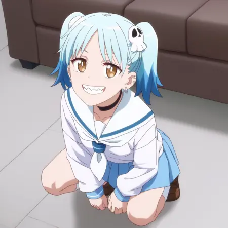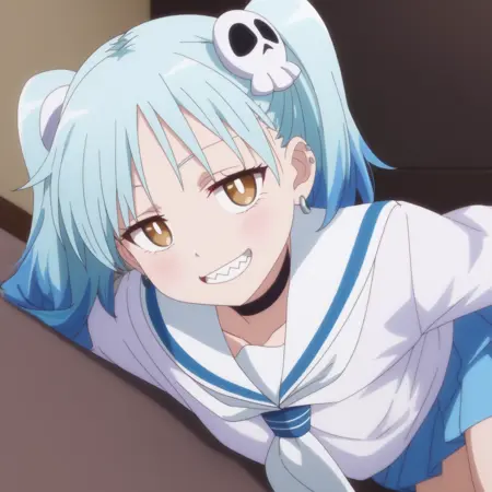 ANAMarin,水蓝色头发,蓝色头发,多色头发,渐变发色,耳环,发饰,刘海,棕色眼睛,头骨发饰,双马尾,短发,眉毛透过头发可见,尖牙,珠宝,耳洞,穿孔,钉状耳环,
