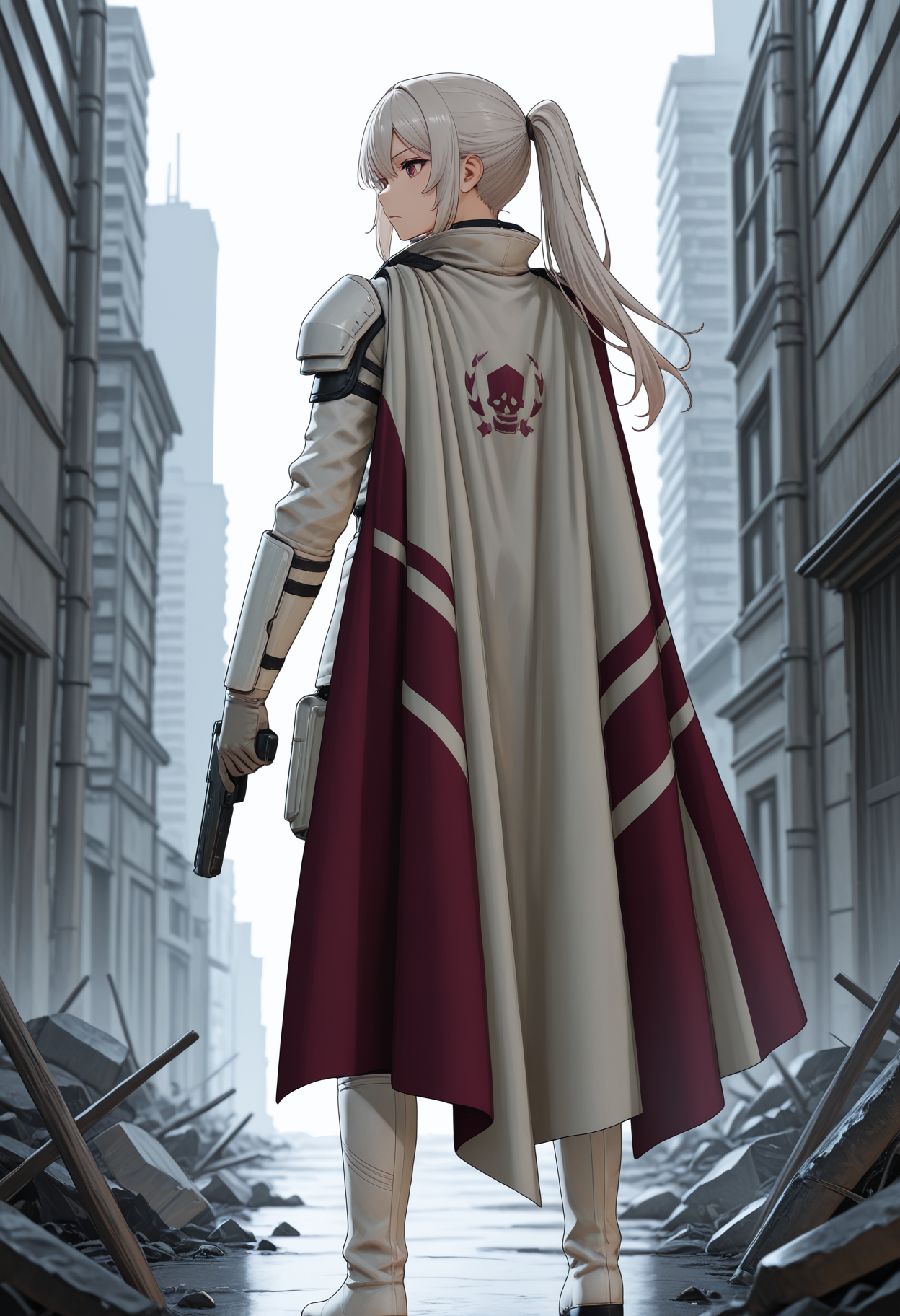 white cape, maroon geometric pattern on cape, red skull emblem on cape