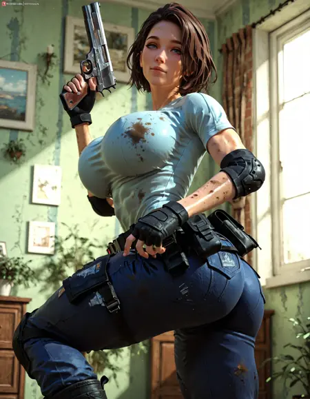 Kt3DX_JillValentine, short hair, dark brown hair, dirty skin
