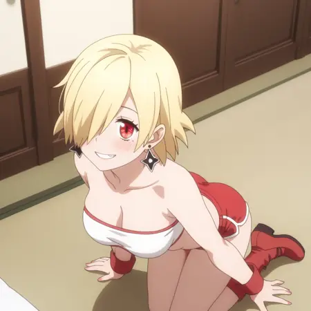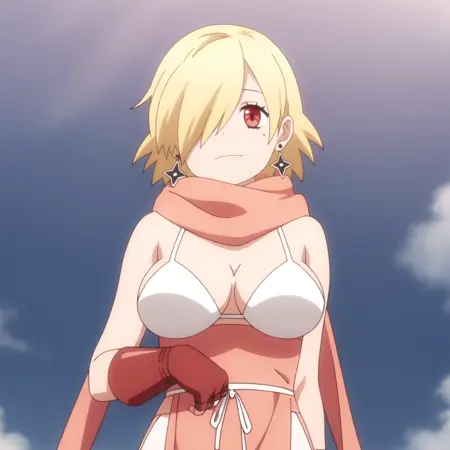 ANAFumiko, 금발, 단발, 귀걸이, 한쪽 눈 위의 머리카락, 붉은 눈, 별 모양 귀걸이, 앞머리, 보석,